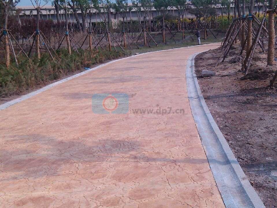 5.等混凝土達(dá)到可以壓膜的時候灑脫膜粉,脫膜粉灑均勻,開始壓膜,要求完成后紋路圖案清晰,整體平整,不出現(xiàn)局部凹凸不平和圖案模糊。