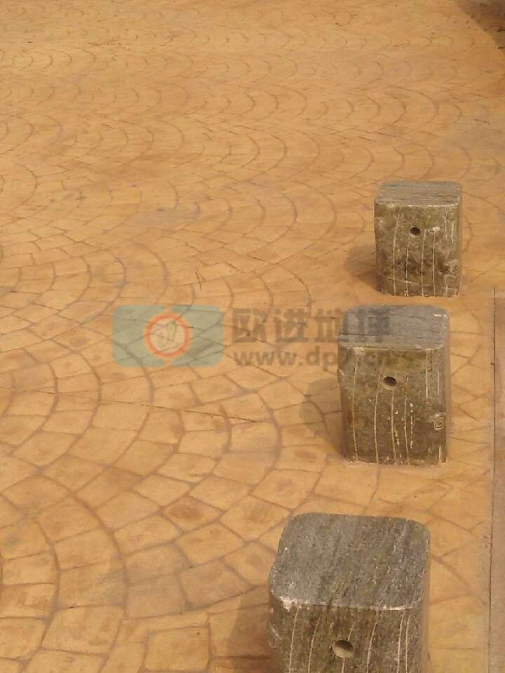 6.壓花地坪常見圖案有:仿木紋、方格磚、扇形、小腳丫、爪子印等。在方格磚、爪子壓膜時要嚴(yán)格控制對縫及壓膜深淺問題。遇隱形井蓋時,要先壓周邊模具,待周邊混凝土壓膜徹底凝固后,再放入內(nèi)圈井蓋,再進(jìn)行井蓋壓膜,同時壓膜的對縫及線條要同周邊一致且對縫。