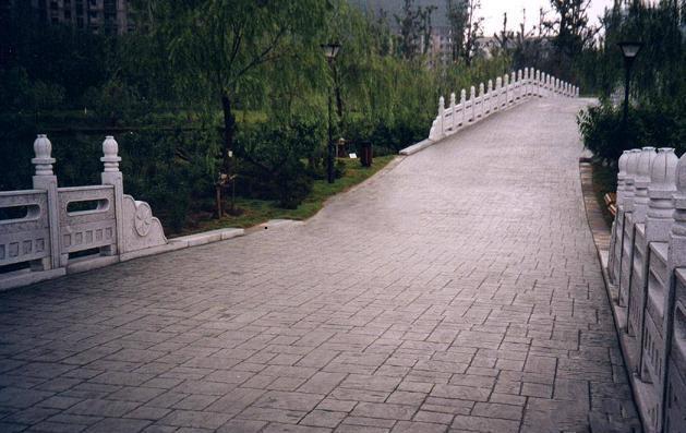 17.依照參照線壓模之后,迅速取出成型模并有條不紊地按順序壓完所有混凝土的表層。如果施工時遇到有靠墻、邊角或其它不規(guī)則處,可以使用彩色藝術地坪邊角模,但使用時要注意與整體圖案的一致與協(xié)調。
