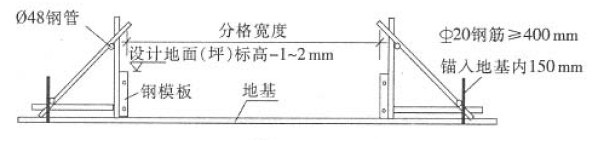 布網(wǎng)鋼筋采用膨脹螈栓焊接法,并按設(shè)計(jì)比例規(guī)格沿棍寧圖澆灌方向排列,實(shí)現(xiàn)基層穩(wěn)固高度固定,減少后期開(kāi)裂,之后采用線繩矯正鋼筋的水平高度和水平直度。在混凝土支模的過(guò)程中,用粘玻璃條替代鋼模板,在地幔厚度較大的情況下,使用通條固定。其只設(shè)方法如圖2。