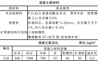 混凝土強度等級C25,采用商品料,罐車直接進車間車體側面傾卸攤鋪,坍落度為130±10mm,水泥占膠凝材料比例為77%,砂率為42%,水灰比0.51,初凝時間4~5h;終凝時間為8~10h。