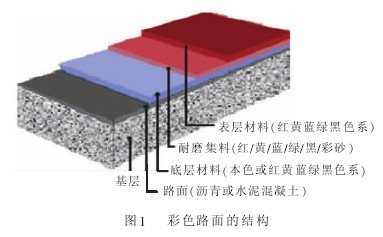 路面的彩色防滑處理技術主要是指通過采用高性能的雙組分丙烯酸樹脂,將混合選定的高耐磨值的防滑骨料鋪設于道路表面,使之與基材完好地結合在一起,在保證極佳的附著力、高耐磨強度的前提下,大大提高了路面的防滑值(SRT60以上),最終減少因道路表面光滑而造成的事故,并縮短剎車距離。彩色防滑路面的結構見圖1。