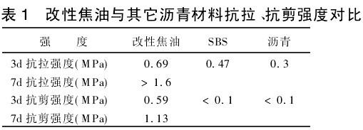 (1)改性焦油(比例1)與其它瀝青材料抗拉、抗剪強(qiáng)度對(duì)比,結(jié)果見表1。