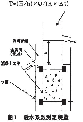 本研究的透水性能測(cè)試采用日本最近提出的《(固定水位透水測(cè)定法》來確定透水系數(shù)。其裝置如圖l所示。該裝置采用高度為H(mm),斷面積為A(mm2)的圓柱形試件,上部密封連接透明的圓柱形套筒,并在套筒的上部設(shè)一流出口。將其放入一個(gè)水槽中,水槽的上部設(shè)出水口。水槽出水口至套筒出水口之間的距離為水位差h。試驗(yàn)前將試件充分飽水,將水槽中充滿水,直至水從出水口流出;從套筒上部不斷給水,使試件上部水位高度保持不變,測(cè)定從水槽出水口流出的水量Q(mm3)和出水時(shí)間At(s),則透水系數(shù)T按下式計(jì)算;