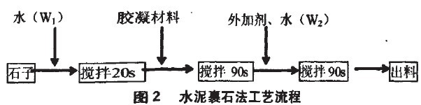 透水性混凝土拌和物中水泥漿稠度較大,且數(shù)量較少,為了保證水泥漿能夠均勻的包裹在集料上,宜采用強(qiáng)制式攪拌機(jī),攪拌時(shí)間為2min~4min。其投料次序采用水泥裹石法,其工藝流程如圖2所示。采用這種方法,預(yù)拌水量(w.)為總用水量的8%~10%。這項(xiàng)技術(shù)要注意控制W.,W,太少石子預(yù)濕不完全,下一步加水泥拌和時(shí),形成不了包裹石子表面的水泥漿殼,W.太多則形成的漿殼很稀,易被第二次加水?dāng)嚢钑r(shí)沖刷破壞,所以要控制好W,和兩次攪拌時(shí)間。
