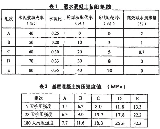 影響透水混凝土的技術(shù)性能的因素有透水方式、材料密度、原材料性能、配合比、成型方法和養(yǎng)護(hù)條件等:而對(duì)于透水混凝土來說,強(qiáng)度和透水性是對(duì)立的,在配合比設(shè)計(jì)時(shí)必須綜合考慮。表l列出了透水混凝土配合比設(shè)計(jì)中的各組參數(shù)。
