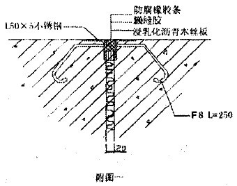 3)變形縫的形式:變形縫邊緣四周均設(shè)置 50 X 5不繡鋼角鐵,不繡鋼角鐵安裝標(biāo)高要準(zhǔn)確、表面要平整,縫隙通順,寬窄~致(如下圖一所示)。