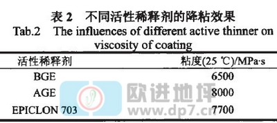 從表2數(shù)據(jù)可以看出:BGE的降粘效果最好,AGE的降粘效果和EPICLON 703的降粘效果相當,采用EPICLON 703制備的涂料其粘度也滿足了無溶劑環(huán)氧自流平地坪涂料對粘度的要求。