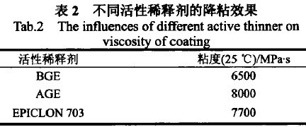 常用的活性稀釋劑主要有AGE、BGE,它們均為低分子質(zhì)量環(huán)氧化合物,較易揮發(fā)、氣味濃、毒性較大,不符合日益增長(zhǎng)的環(huán)保要求。EPICLON 703為C12.C14烷基縮水甘油醚,沸點(diǎn)高達(dá)107℃,不易揮發(fā),極低的氣味,毒性低,具有優(yōu)異的顏填料潤(rùn)濕能力,是一種環(huán)保型環(huán)氧活性稀釋劑。不同的活性稀釋劑對(duì)漆料的降粘效果不一樣。保持其它條件不變,分別采用BGE、AGE和EPIcLON 703制漆,測(cè)定它們的粘度,以觀察不同活性稀釋劑的降粘效果。粘度測(cè)試結(jié)果見(jiàn)表2。