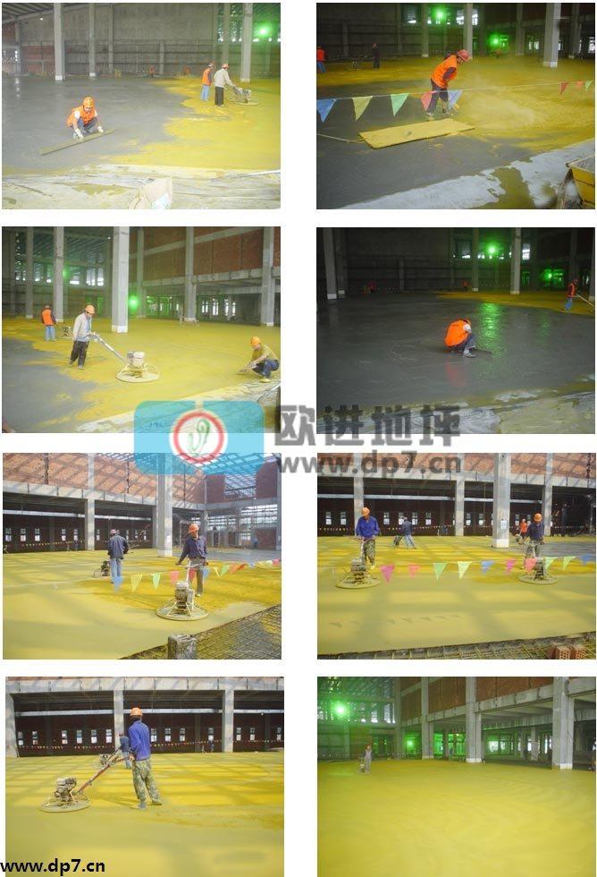 4.8 做好分塊標(biāo)記,測(cè)算所需硬化劑材料的用量。將規(guī)定用量2/3 的硬化劑產(chǎn)品按標(biāo)劃的板塊面積用手工均勻撒布在初凝的混凝土表面上,完成第一次撒布作業(yè),待材料吸收一定水分后,進(jìn)行機(jī)械圓盤的鏝抹作業(yè);第一層材料硬化至一定階段時(shí),進(jìn)行第二次撒布剩余的材料。待材料吸收水分后,視混凝土的硬化情況,進(jìn)行至少圓盤三次機(jī)械鏝抹作業(yè)。