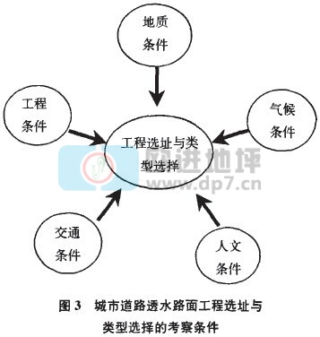 歐美等國家城市道路透水性路面設(shè)計主要包括5步:工程選址與評估一透水鋪裝材料選用與評估一透水路面結(jié)構(gòu)設(shè)計分析一透水路面施工與質(zhì)量控制一透水路面成效評估.其中,工程選址與評估為首要步驟,與透水路面選型密切相關(guān),兩者共同決定透水路面工程的可行性、適用性、實用性、經(jīng)濟性;但具體操作方法不盡相同,美國偏重試驗法,日本采用試驗一經(jīng)驗法,我國臺灣則采用人文、水文、地文調(diào)查法,綜合上述各方法優(yōu)點,結(jié)合我國實際,本研究認(rèn)為我國在進(jìn)行城市道路透水路面建設(shè)工程選址與類型選擇時,可在常規(guī)工程選址調(diào)查的基礎(chǔ)上,綜合考察圖所示的地質(zhì)、氣候、人文,交通、工程等5方面條件,做出合理決策。