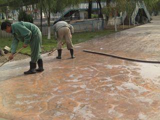 | | 藝術(shù)地坪施工10. 用水或去污劑清洗表面, 清洗擦刷表面一定要保證整個地坪清洗程度一致,否則會造成地面顏色深淺不一; |