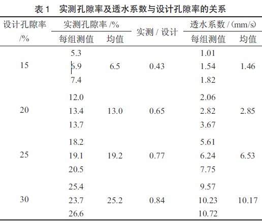試驗采用粒徑為10~20 mm 的碎石,設(shè)計透水混凝土的孔隙率為15%、20%、25%和30%時,研究設(shè)計孔隙率、實測孔隙率與透水系數(shù)的關(guān)系,試驗結(jié)果見表1 及圖1。