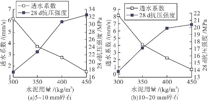 從圖3 中可以看出,不論使用哪種石子,透水混凝土的抗壓強(qiáng)度皆隨水泥用量的增加而增加,而透水系數(shù)則隨著水泥用量的增加而減小。在相同水泥用量的情況下,對比兩種不同粒徑的碎石可發(fā)現(xiàn),使用5~10 mm 的碎石配制的透水混凝土抗壓強(qiáng)度值較高,但透水系數(shù)較低,而10~20 mm 的碎石得到的相反結(jié)果。使用大粒徑骨料配制的透水混凝土抗壓強(qiáng)度較低,主要是因為骨料粒徑越大,骨料間的咬合點越少,由此產(chǎn)生的咬合摩擦力及其與水泥漿體的黏接力減少所致。因此,進(jìn)行透水混凝土的配合比設(shè)計時,有必要把“骨料級配與粒徑”作為一個設(shè)計參數(shù),根據(jù)設(shè)計要求選擇合適的骨料級配與粒徑,才可得到透水系數(shù)和抗壓強(qiáng)度相匹配的透水混凝土。