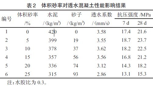 (3)在透水混凝土中摻入適量體積的砂子會提高混凝土的抗壓強(qiáng)度而不降低其透水性能,對于不同的水泥用量及骨料級配,應(yīng)選擇合理的體積砂率。